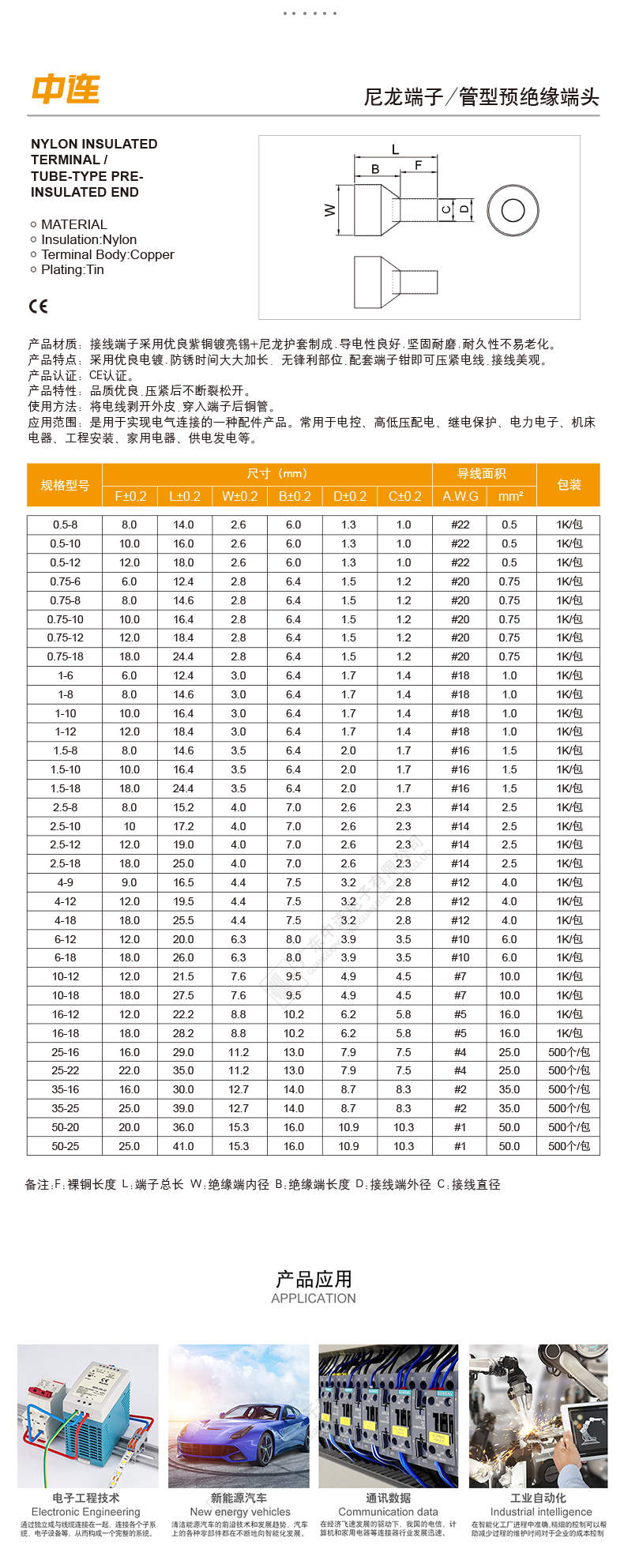 接线端子采用优良紫铜镀亮锡+尼龙护套制成.导电性良好.坚固耐磨.耐久性不易老化。