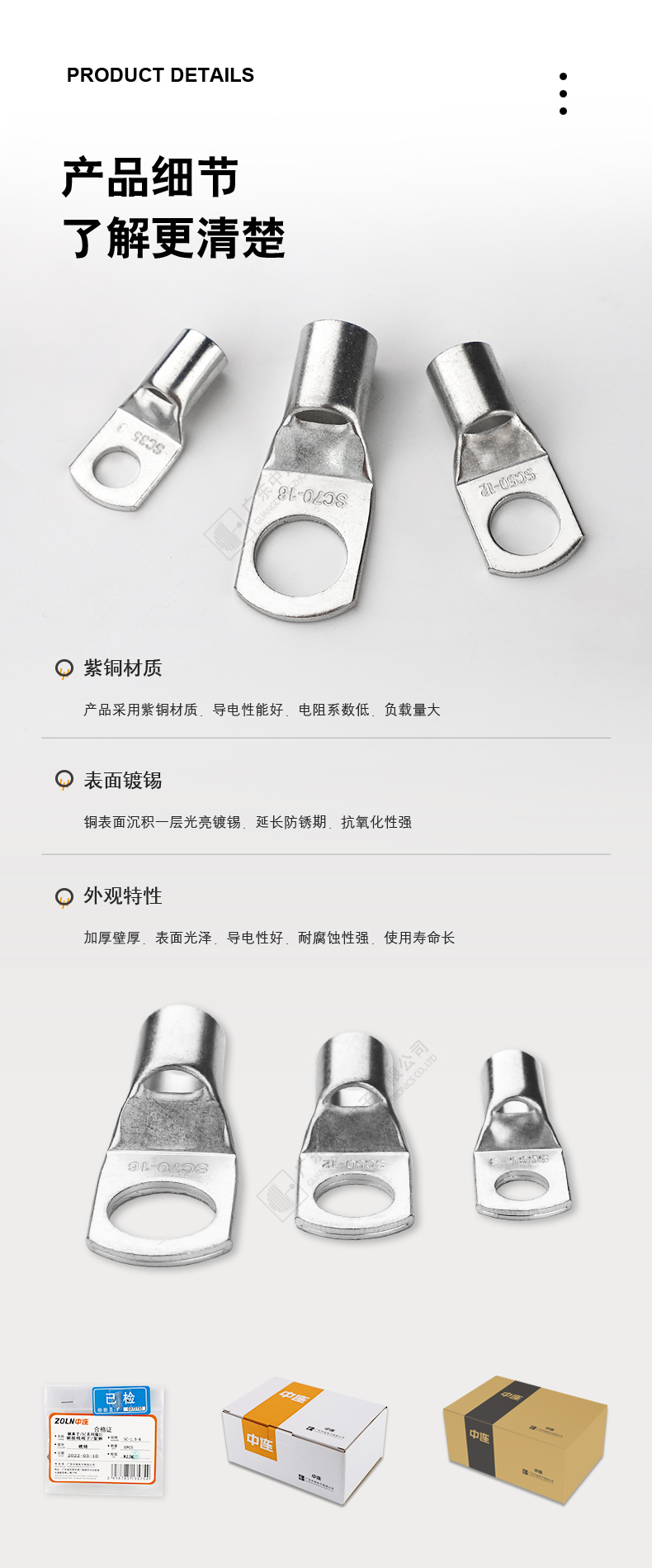 产品采用紫铜材质:导电性能好:电阻系数低:负载量大。